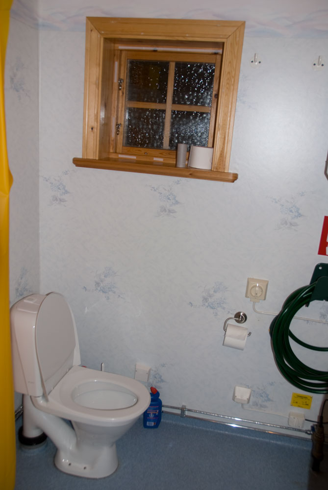 De badkamer is typisch Zweeds. In Nederland heeft iedereen een keurig nette douchehoek met een glazen wand eromheen. In Zweden geven ze daar niet zo veel om.